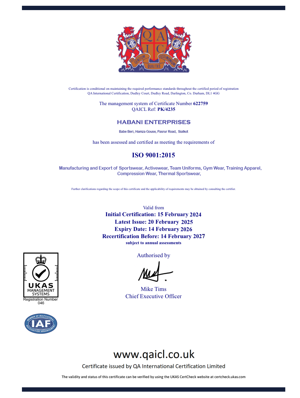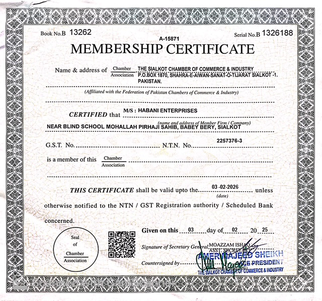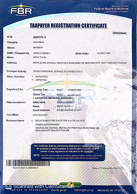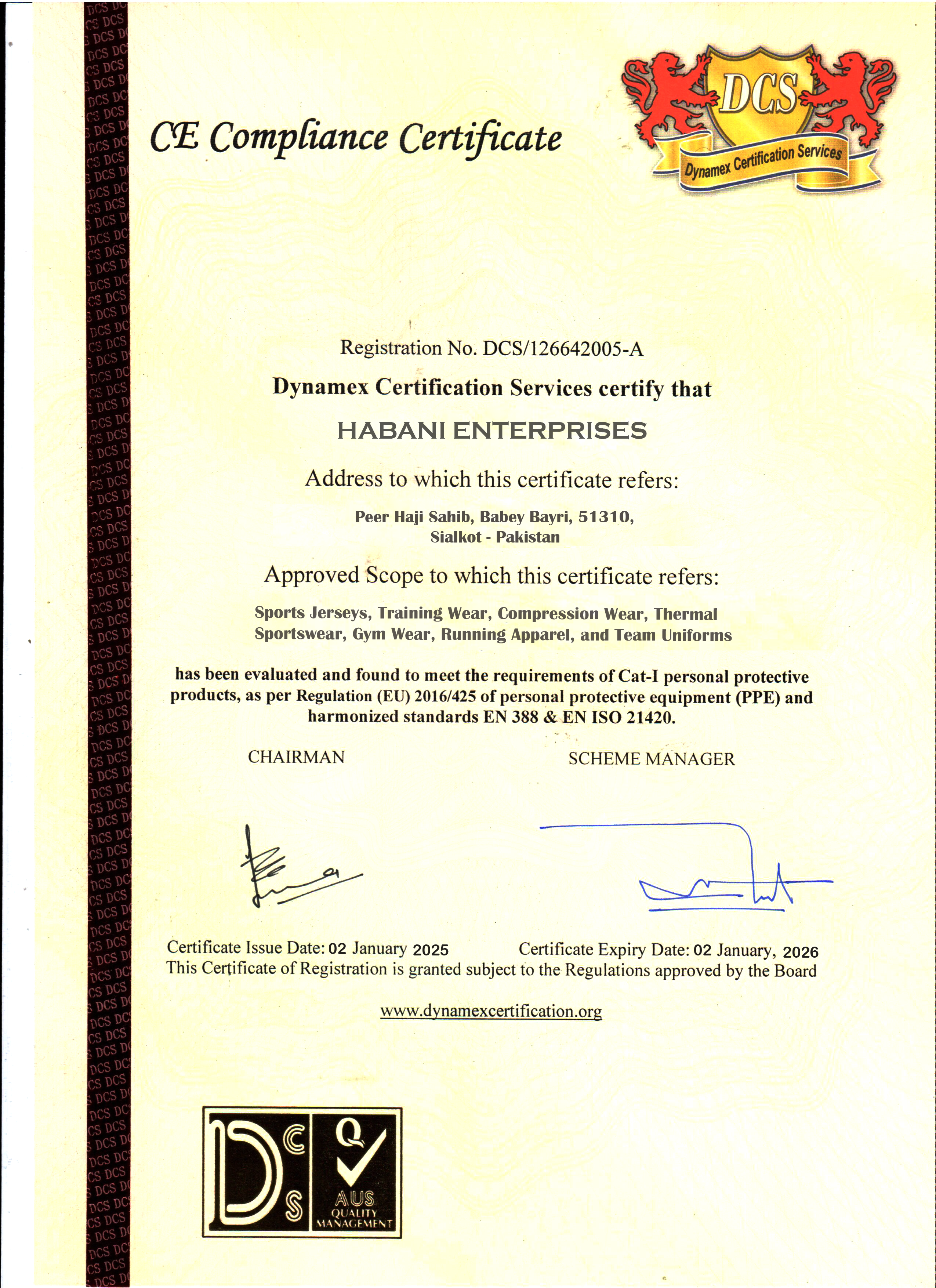 Certifications HABANI ENTERPRISES Near Blind School , Peer Haji Shahib , Babay Beri , Sialkot-51310 , Pakistan.Manufacturers and Exporters Of Sports Wear , Fitness Wear , Causal Wear and accessories.